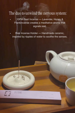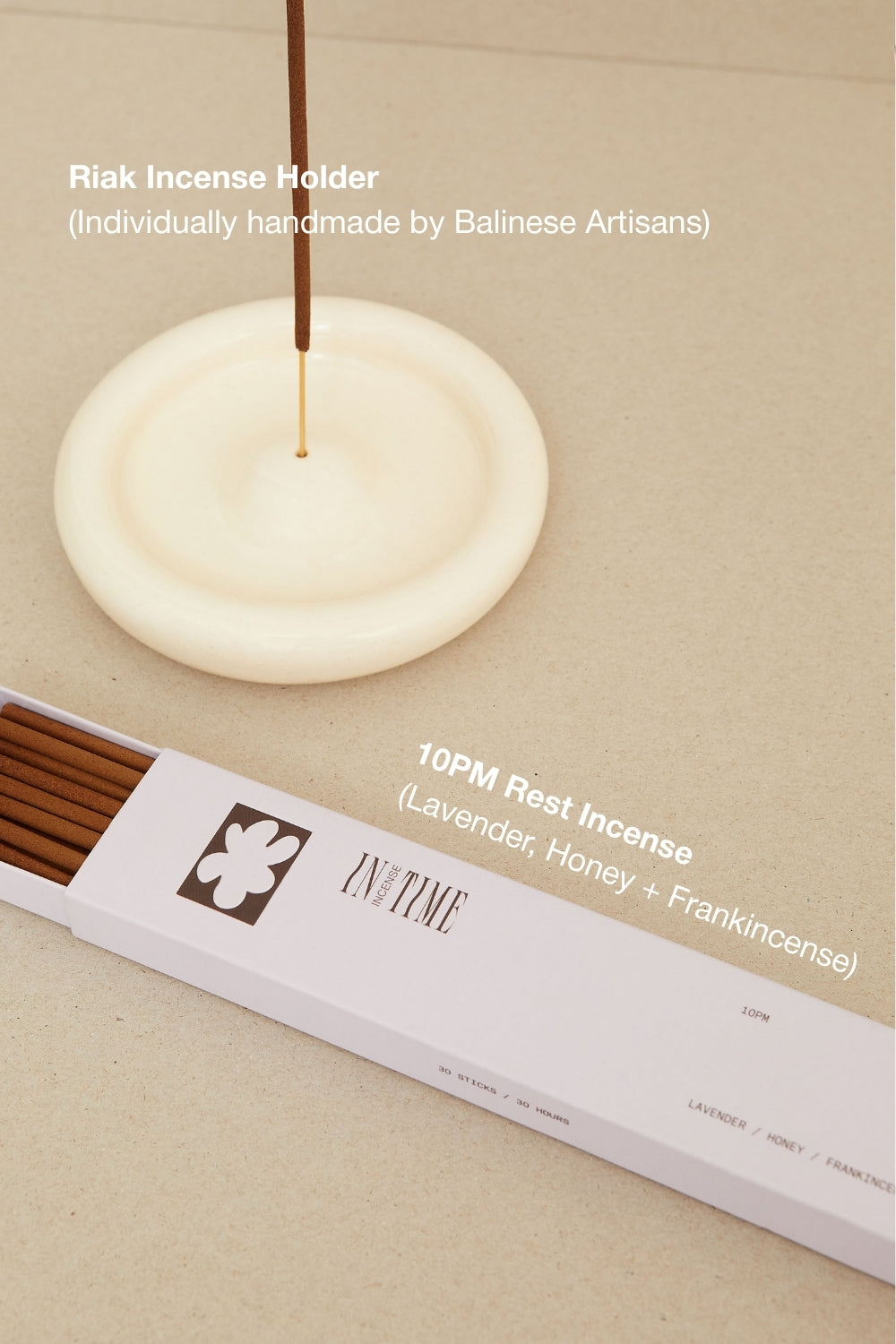 - Riak Ceramic Incense Holder: A handcrafted treasure by Balinese artisans, inspired by tranquil ocean waves — the perfect calming anchor to ground your evenings.